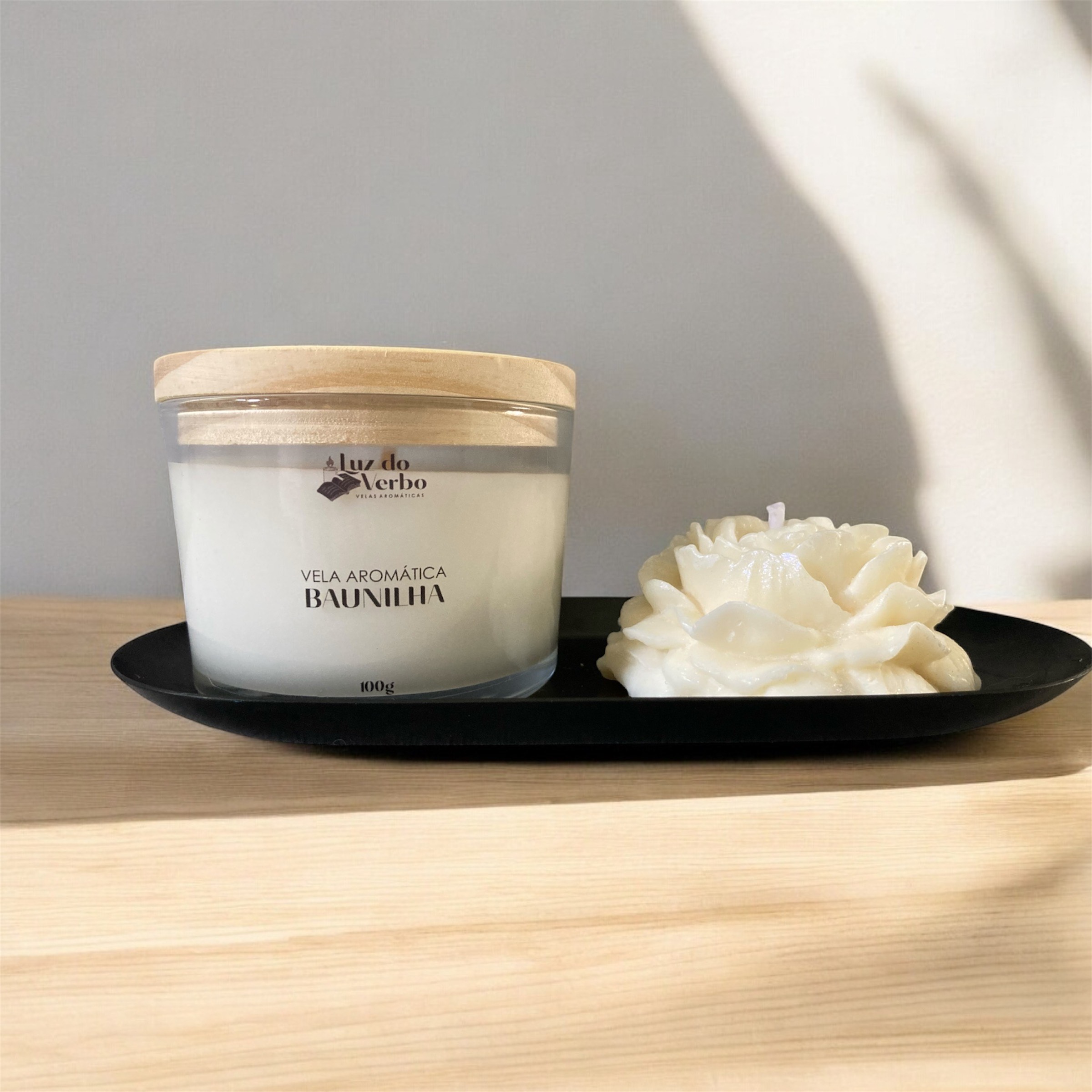 • Vela aromática artesanal de 100g, onde você pode escolher o aroma que mais combina com o seu momento.